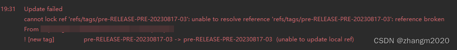 去该项目下的.git文件里找到报错文件,本例中即为:.git/refs/tags/pre-RELEASE-PRE-20230817-03。删除该文件,重新pull,pull成功问题解决。百度了很多方案,过滤出了有效方案。