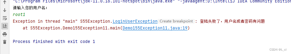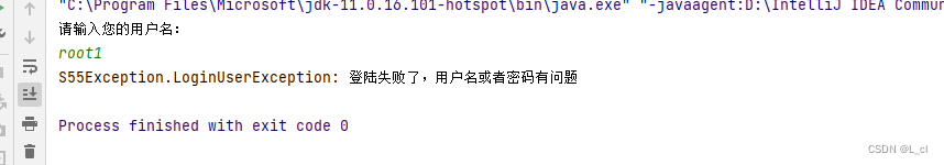 import javax.security.auth.login.LoginException; import java.util.Scanner; public class Demo155Exception11 { public static void main(String[] args) throws LoginUserException { // 1.定义一个用户名,代表已经注册的用户 String username = "root"; // 2.创建Scanner对象,录入用户名 Scanner sc = new Scanner(System.in); System.out.println("请输入您的用户名:"); String name = sc.next(); // 3.判断用户名是否和已经存在的用户名一致 if(name.equals(username)){ System.out.println("登陆成功"); }else{ // 利用有参构造给异常写原因 throw new LoginUserException("登陆失败了,用户名或者密码有问题"); } }public class LoginUserException extends Exception{ public LoginUserException() { } public LoginUserException(String message) { super(message); } }