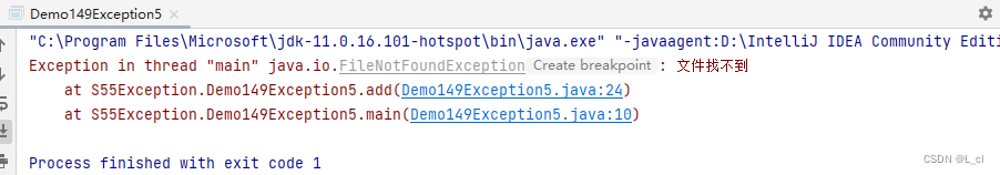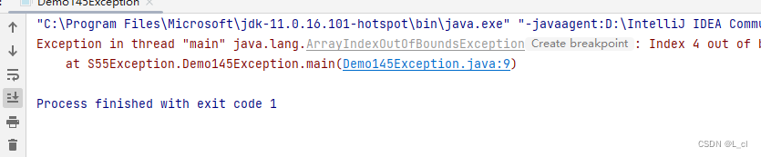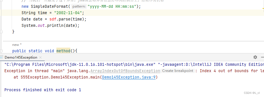 public class Demo145Exception { public static void main(String[] args) { // 编译时期异常 // 编译时期的异常是调用方法时,该方法底层给我们抛了一个编译时期异常,所以导致我们一调用此方法就爆红了 // 当我们一旦触发了这个异常,jvm就会将异常信息打印到控制台上,给程序员们看 new SimpleDateFormat("yyyy-MM-dd HH:mm:ss"); String time = "2002-11-04"; Date date = sdf.parse(time); System.out.println(date); } }