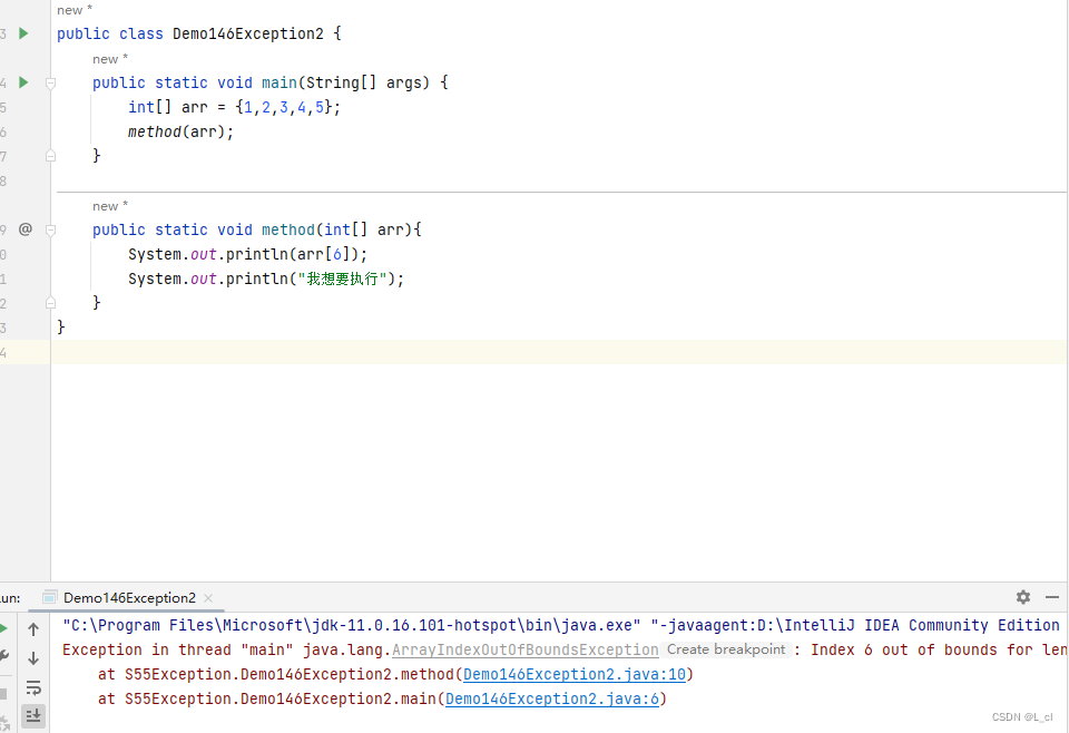 public class Demo146Exception2 { public static void main(String[] args) { int[] arr = {1,2,3,4,5}; method(arr); } public static void method(int[] arr){ System.out.println(arr[6]); System.out.println("我想要执行"); } }