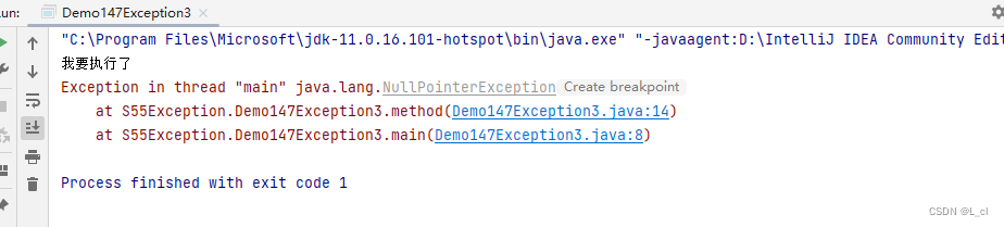 public class Demo147Exception3 { public static void main(String[] args) { String s = "a.txt"; method(s); String ss = "a.txit"; method(ss); } public static void method(String s){ if (!s.endsWith(".txt")){ // 故意创建异常对象,用throw说明此处有异常 throw new NullPointerException(); } System.out.println("我要执行了"); } }