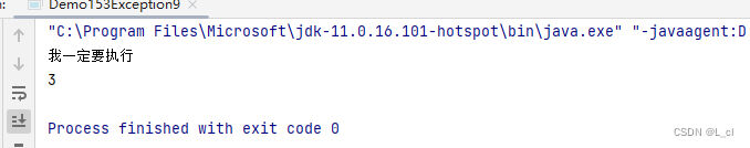 public class Demo153Exception9 { public static void main(String[] args) { int result = method(); System.out.println(result); } public static int method(){ try { String s = null; System.out.println(s.length());// 空指针异常 return 2; }catch (Exception e){ return 1; }finally { System.out.println("我一定要执行"); return 3; } }