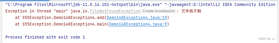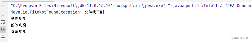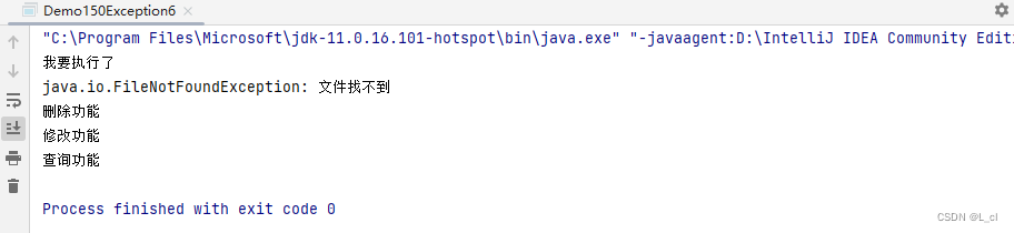 public static void main(String[] args) { String s = "a.txt"; String s1 = "a"; try{ add(s); //添加功能 }catch (FileNotFoundException e){ System.out.println(e); } try{ add(s1); //添加功能 }catch (FileNotFoundException e){ System.out.println(e); } delete(); // 删除功能 update(); // 修改功能 find(); // 查询功能 } private static void add(String s)throws FileNotFoundException { if (!s.endsWith(".txt")){ // 故意创造一个异常 属于编译时期的异常 throw new FileNotFoundException("文件找不到"); } System.out.println("我要执行了"); } private static void find() { System.out.println("查询功能"); } private static void update() { System.out.println("修改功能"); } private static void delete() { System.out.println("删除功能"); }