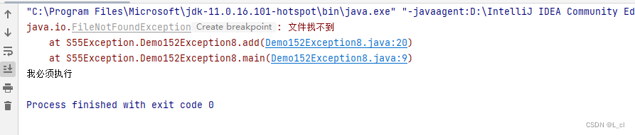 public static void main(String[] args) { String s = "a.txt1"; try { add(s); // 添加功能 } catch (FileNotFoundException e) { e.printStackTrace(); }finally { System.out.println("我必须执行"); } } private static void add(String s)throws FileNotFoundException { if (!s.endsWith(".txt")){ // 故意创造一个异常 属于编译时期的异常 throw new FileNotFoundException("文件找不到"); } System.out.println("我要执行了"); }