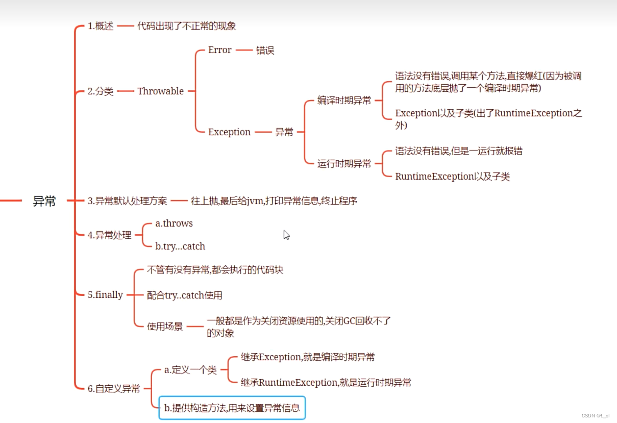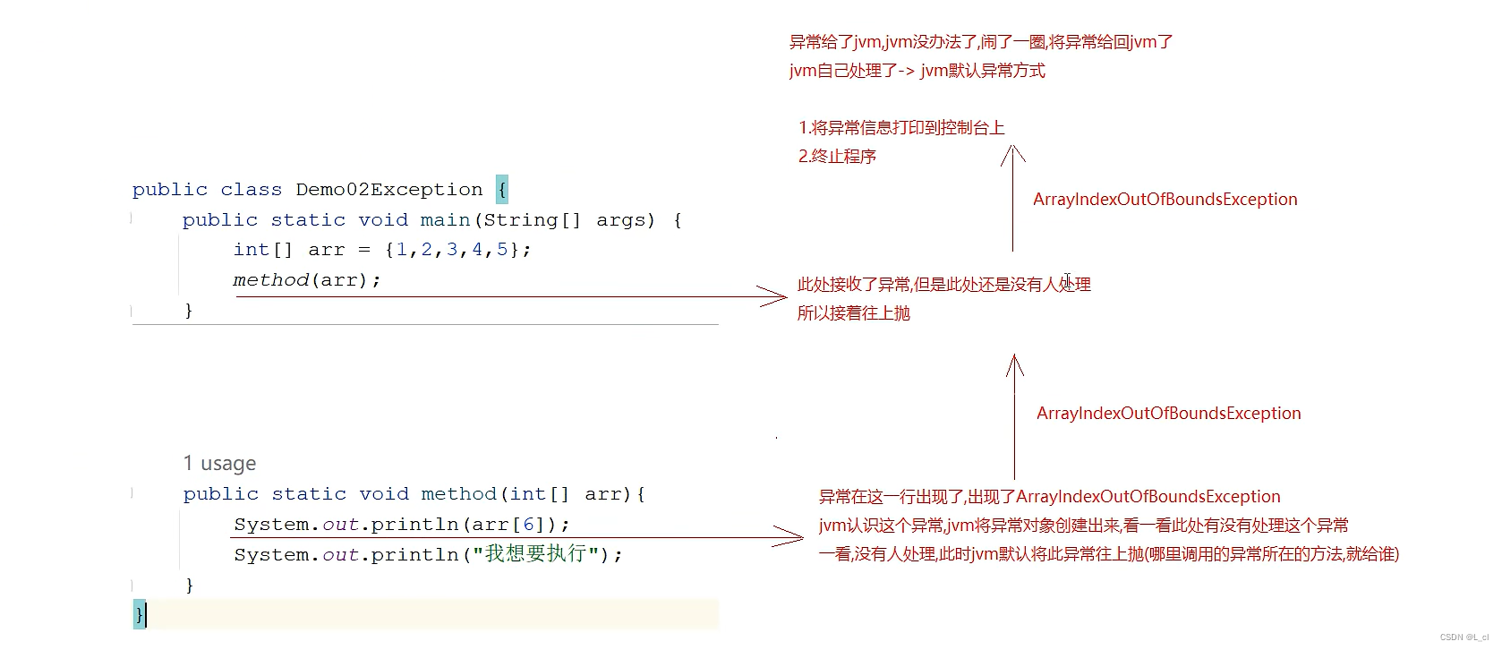 3.异常默认外理方案 —— 往上抛,最后给jvm,打印异常信息,终止程序4.异常处理