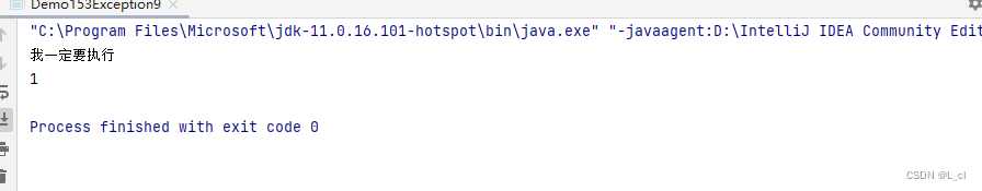 public class Demo153Exception9 { public static void main(String[] args) { int result = method(); System.out.println(result); } public static int method(){ try { String s = null; System.out.println(s.length());// 空指针异常 return 2; }catch (Exception e){ return 1; // return 1 代表的是将1返回,结束方法 }finally { System.out.println("我一定要执行"); } }