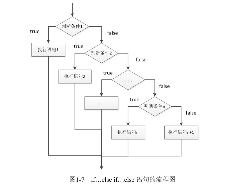 if(布尔表达式 1){ //如果布尔表达式 1的值为true执行代码 }else if(布尔表达式 2){ //如果布尔表达式 2的值为true执行代码 }else if(布尔表达式 3){ //如果布尔表达式 3的值为true执行代码 }else { //如果以上布尔表达式都不为true执行代码 } -