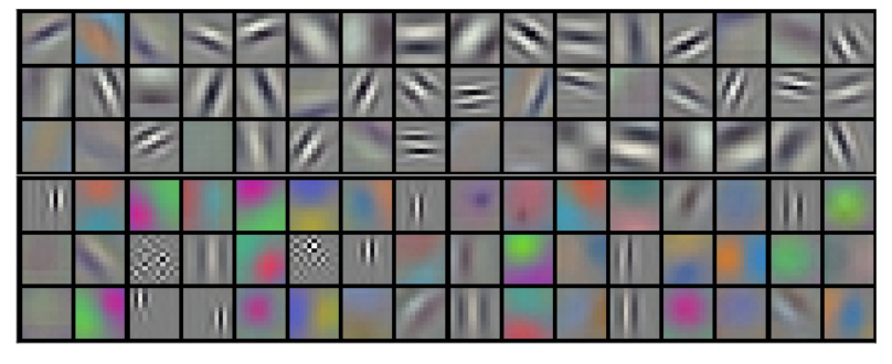 AlexNet里也有一个经典的发现,上图中前三行是 GPU1 学习到的滤波器,后三行是GPU2学习到的滤波器。可以发现一个主要学习了纹理、梯度信息,另一个主要学习了色彩信息,可以理解为不同的子空间。