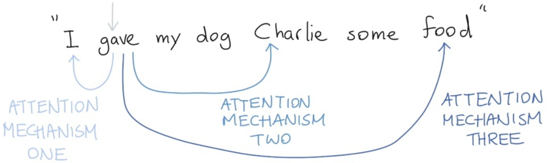 Transformer来自于自然语言处理,在真实语言环境中,每一个词和不同的词,都有不同的关系。可以用不同的 Attention 来补充这些不同的关系。上图展示了三种 attention,即三个子空间,放在子空间里可以更好的学习这种关系。