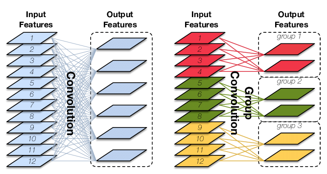 精度提升: 分组可以把特征变为若干子空间(subspace),对于图像信息有更加全面的了解。有些像Transformer 里的 Multi-Head Self-Attention,只不过 Transformer 里面是对注意力计算分组,起了个名字叫做“多头”,而组卷积里是对 convolution 分组。