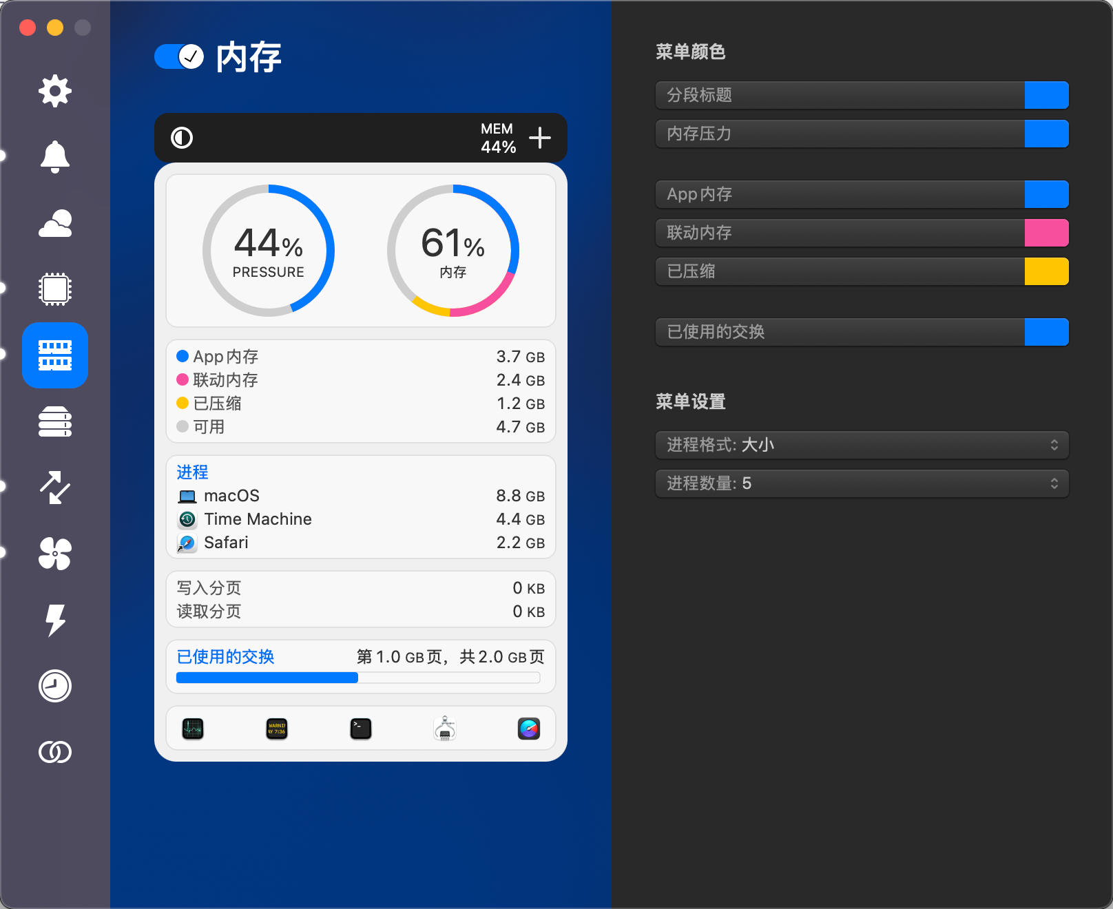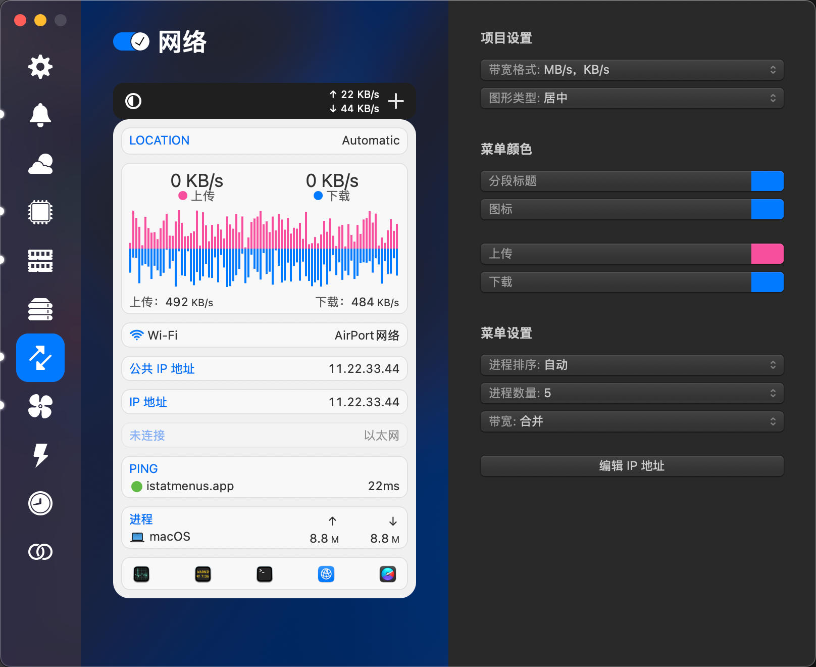 它和 macOS 贴合得像原生设计,展开面板时,历史趋势流畅滚动,信息密度很高。那种装好之后“抬头即见”简直太方便了,CPU使用了多少、内存使用了多少、网速状况都能实时看到。