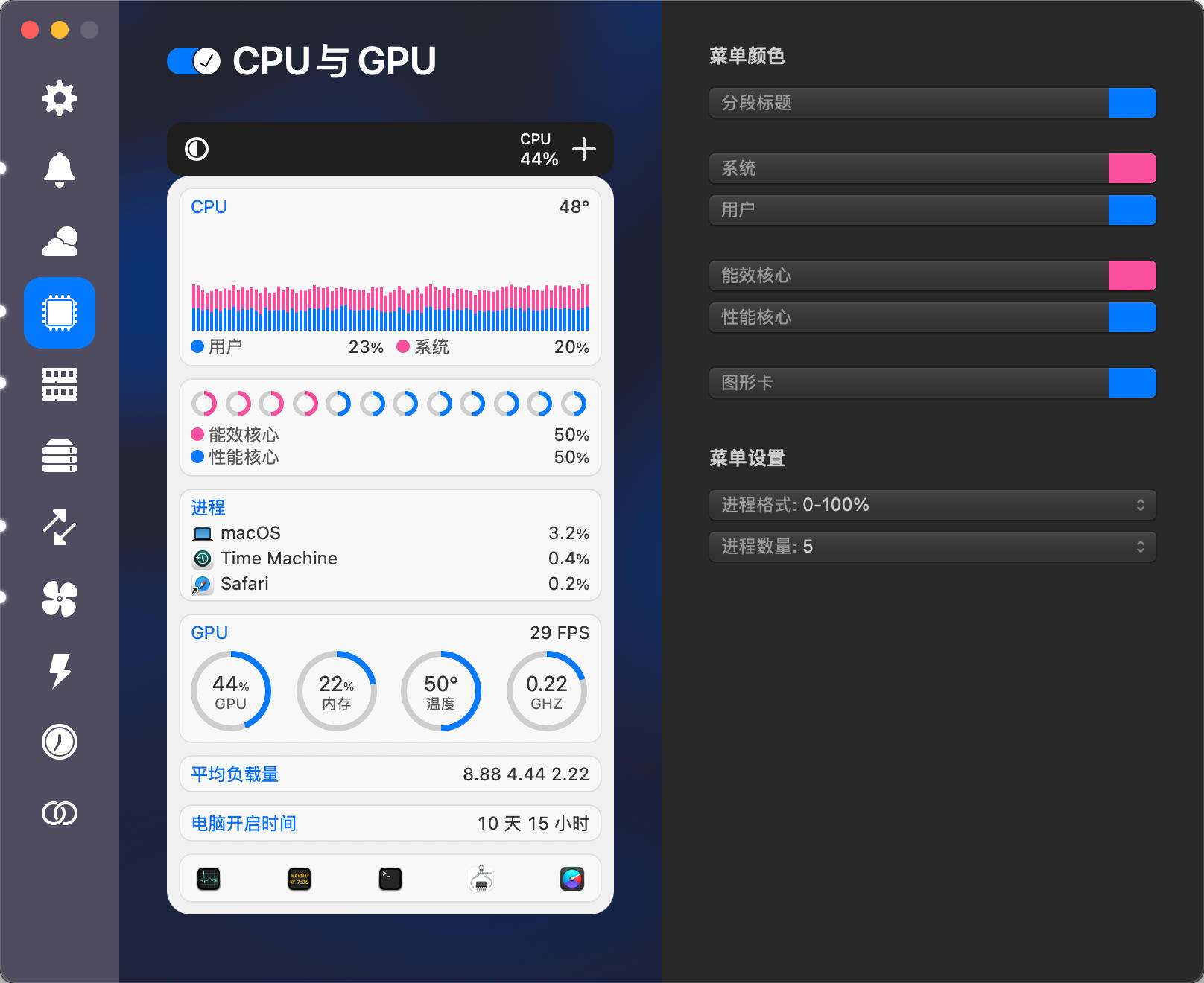我觉得最赞的莫过于CPU/GPU 实时监控。那天我在剪映里剪 4K 素材,画面突然顿挫,我以为是硬盘太慢,差点跑去买读卡器。结果一瞥菜单栏,CPU 某几颗核心正被后台转码占满,GPU 峰值也在高位。我暂停了不必要的渲染,性能立刻回来了。