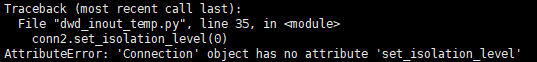 1 conn1 = gputil.connect(logger,target_host,target_user,target_password,target_db) 2 conn2 = psycopg2.connect(database=target_db, user=target_user, password=target_password,host=target_host) 3 # conn2.set_isolation_level(0) 如果psycopg是2.4.2版本前的,只能这样写 4 conn2.set_isolation_level(psycopg2.extensions.ISOLATION_LEVEL_AUTOCOMMIT) 5 6 cur1 = conn1.cursor() 7 cur2 = conn2.cursor() 8 9 cur2.execute(sql_gp1) 10 11 cur1.execute(sql_gp2) 12 conn1.commit() 13 14 os.system("python /application/datax2/bin/datax.py /root/test_hgm/access_record_process/dwd_inout_temp.json") 15 conn1.commit()