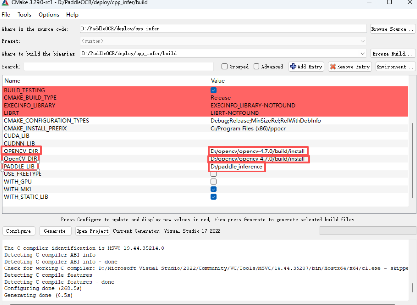 需要安装Cmake和Vs,VS推荐2022;源码位于PaddleOCR\deploy\cpp_infer路径下,在CMake里需要配置opencv路径,如选择GPU版本需要配置Cuda和Cudnn路径;