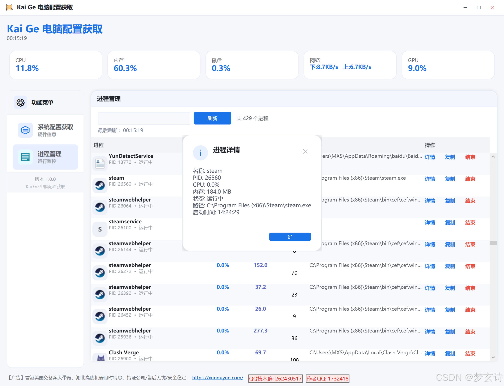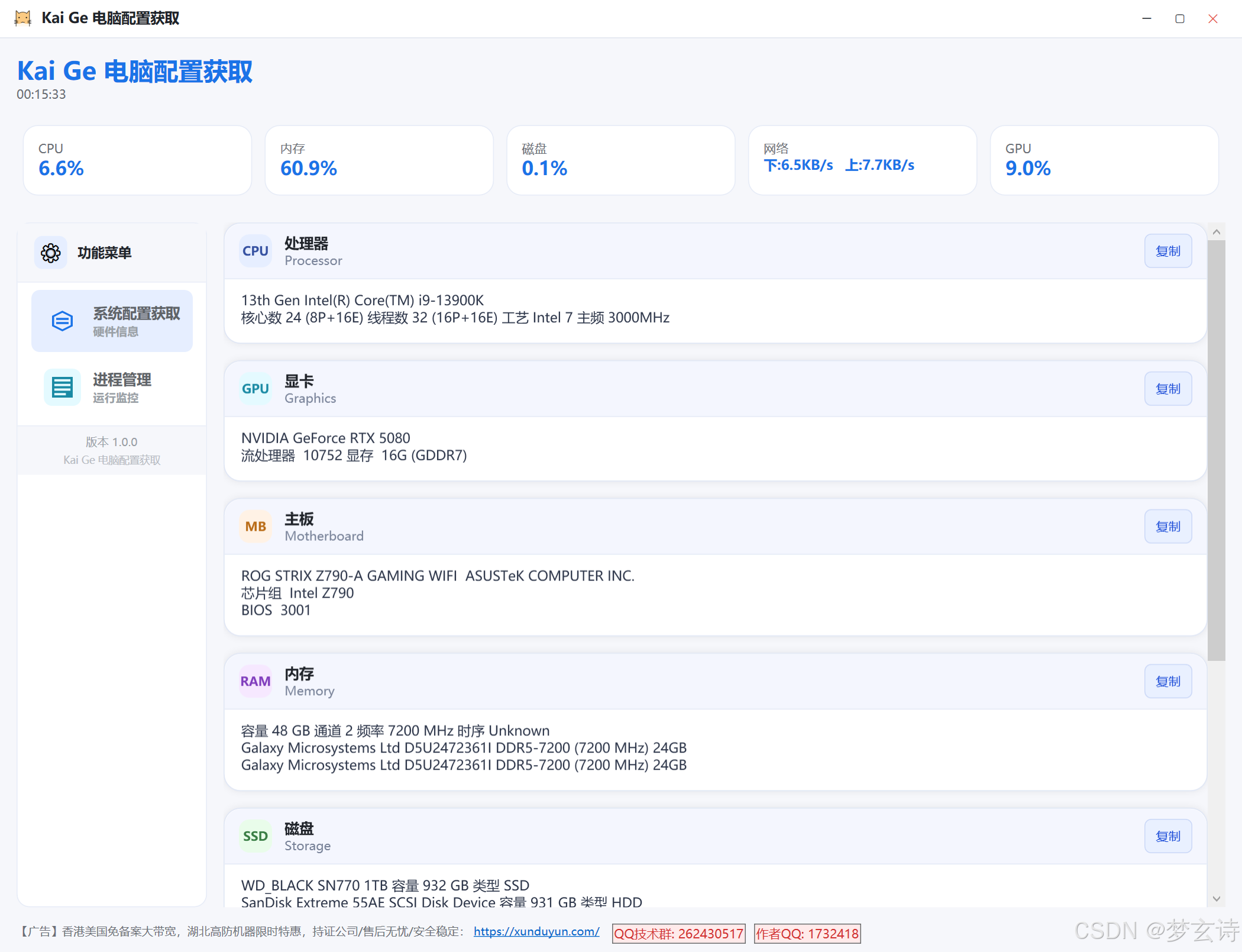 Kai Ge 电脑配置获取 - 系统硬件信息与进程监控工具