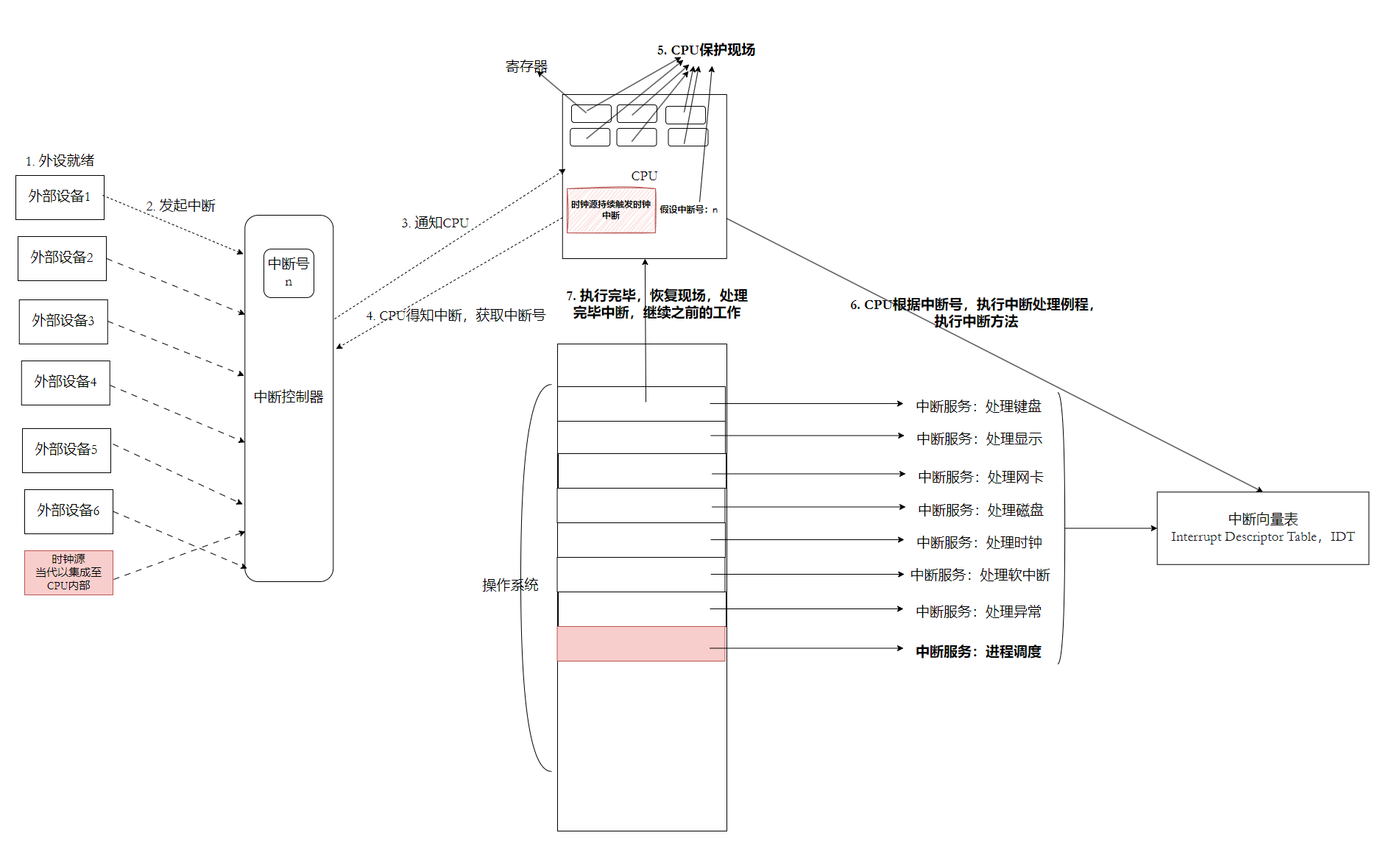 - 由外部设备触发的,中断系统运⾏流程,叫做硬件中断