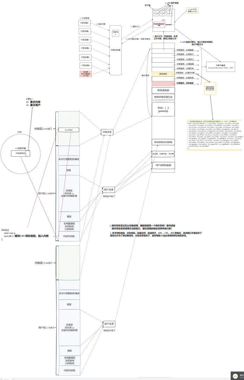 - 为了让操作系统⽀持进⾏系统调⽤,CPU也设计了对应的汇编指令(int 或者 syscall),可以让CPU内部触发中断逻辑。