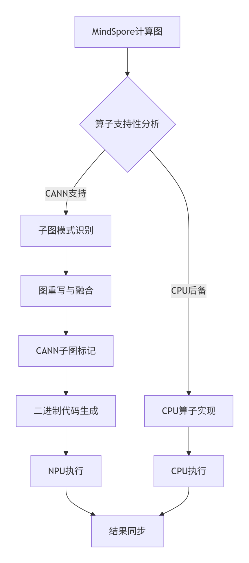 在实际代码中,这种协同通过双重分发机制实现。MindSpore在图编译阶段识别NPU可优化的子图模式,通过GraphOptimization类中的PartitionForCann方法进行子图标记。标记后的子图通过BuildKernel调用CANN的算子接口,形成完整执行链路。