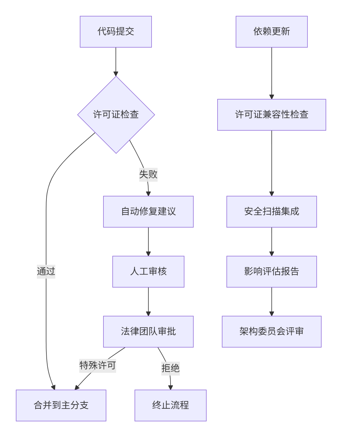 在某大型AI框架项目中,我们建立了三级许可证管理体系: