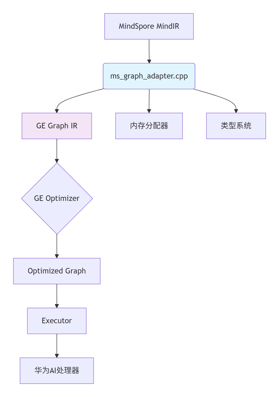 GE作为面向华为AI处理器的图编译器和执行器,其核心使命是将高层框架(如MindSpore、TensorFlow)描述的计算图,翻译优化成能在硬件上高效执行的指令流。这个过程中,ms_graph_adapter.cpp扮演着 “翻译官” 的角色。