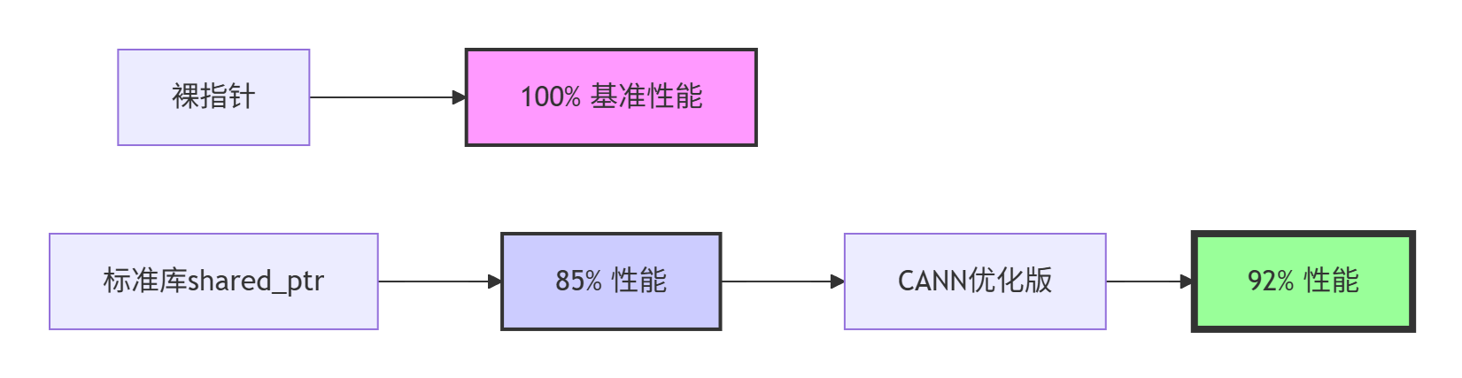 智能指针的性能关键在于减少原子操作和内存分配。以下是不同实现的性能对比: