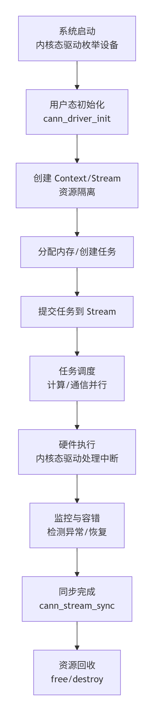 driver 的核心工作流程可总结为“设备初始化 → 资源分配 → 任务提交 → 调度执行 → 监控容错 → 资源回收”,具体流程如图 2 所示:
