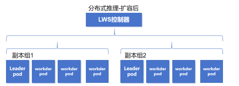 组级生命周期管理,用于支持组级别的弹性伸缩、滚动升级和重启,提升服务高可用性。LWS会把一起干同一个推理任务的多个Pod分成一个“副本组”,里面有1个Leader Pod(组长)和多个Worker Pod(组员)。在弹性伸缩时,是以副本组为单位做扩缩容。