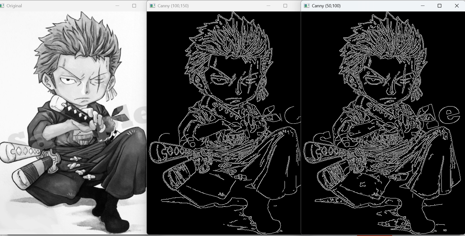 zl_canny = cv2.Canny(zl, 100, 150) # 低阈值100,高阈值150