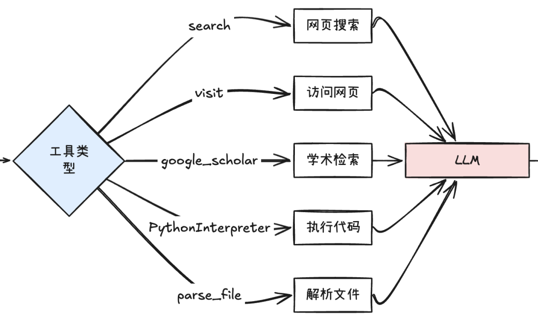 相信这也是Tongyi-DeepResearch在训练中重点学习使用的工具集。其中parse_file只有当输入了供研究的本地文件时才会用到。各工具的实现机制大致为: