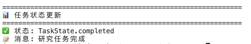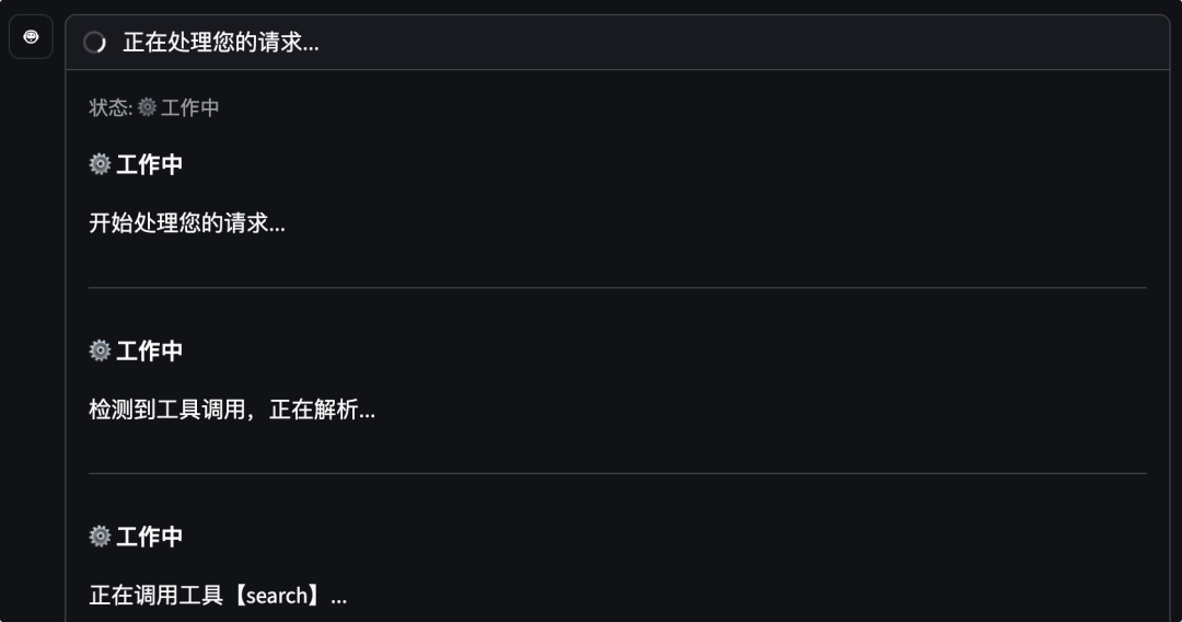 可以看到Agent工作过程,借助A2A协议可以轻松的实现任务异步运行(前端退出不影响任务执行),也可以持续观察任务处理过程: