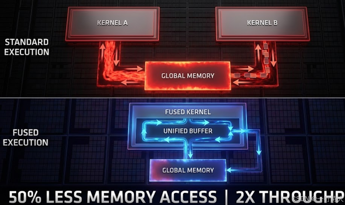 融合算子(Kernel Fusion) 的核心思想就是:切完菜直接扔锅里。 即:FusedOp(Read -> Compute1 -> Compute2 -> Write)。