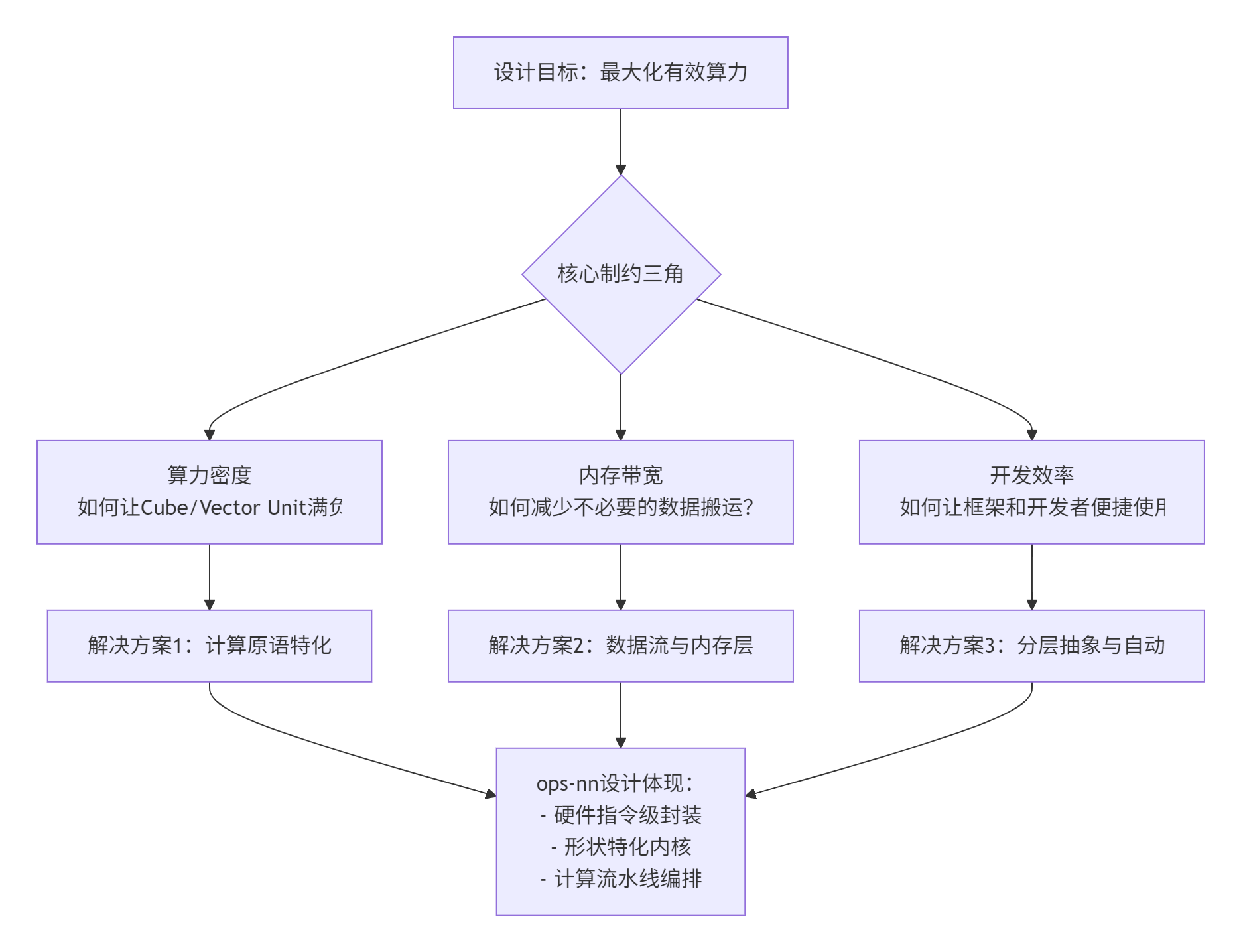 图1:ops-nn设计面临的核心三角制约及其化解思路
